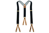 Levi's® Vintage Clothing produced two new pair of suspenders to compliment the Spring/Summer 2016 collection; The first being a charcoal pinstripe with aged black hardware & black cowhide fasteners, & the second, this grey marl elastic accented with sturdy cognac colored leather trim and aged brass hardware.